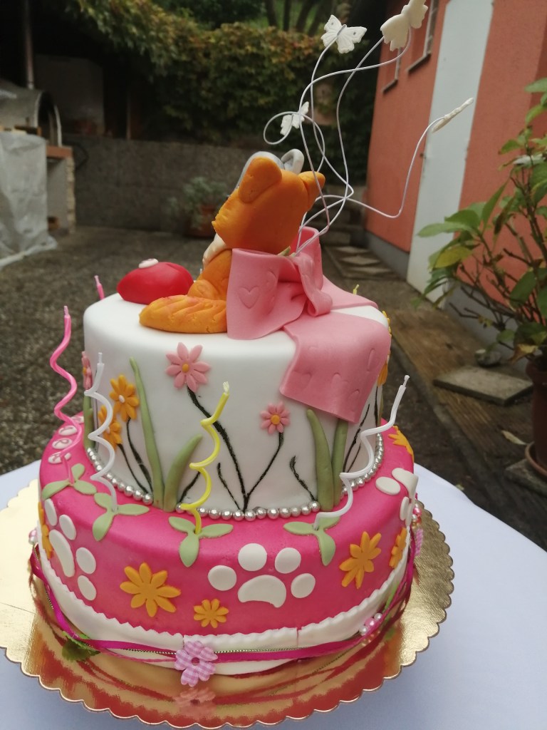 Mithilfe meines Mannes habe ich die Torte am nächsten Tag noch fertiggestellt. Aber da ich seither mit Krücken unterwegs bin und den Fuß dauernd hochlagern muss, konnte ich an der Feier leider nicht persönlich teilnehmen.